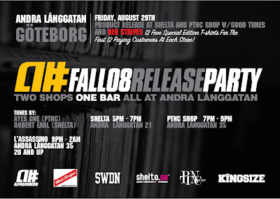Nu på fredag den 29:e augusti ställer Alphanumeric till med en rejäl fest i samband med A# nya kollektion som vi får in i butiken. Festen börjar hos oss på Shelta på Andra Långgatan 21, sedan dundrar den vidare på min polare Jake´s skateshop PTNC på Andra Långgatan 35, och sen brakar det loss totalt på baren L´Assassiono på Andra Långgatan 35. Alphanumeric bjuder på Andra Långgatan x Alphanumeric limited edition tees (24 st printade endast för denna fest…), samt ca 700 st öl!!! Shelta´s egen skruvskurk Robert Earl bakom spakarna på Shelta, och breakdoktorn Ayes One (Scratch) på PTNC. Vi börjar klockan 17.00 så att vi hinner dricka upp alla öl. Vad tror ni om det? Ses där antar jag… Klicka på flyern för mer info…