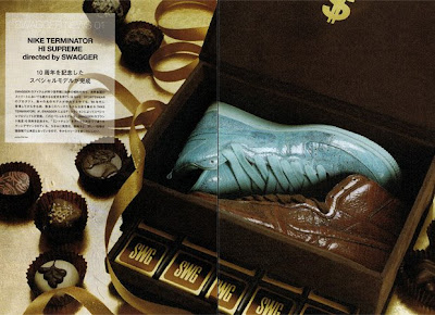 Vadå Yeezy? Nike´s nästa must-have-mega-limited-quickstrike-släpp kommer från japanska Swagger som med sitt 10-årsjubileum collaborerar med en Terminator Hi Supreme. De enda bilderna som läckt kommer från LacedMag och Swagger Magazine, och visar kicks i faux croc-skin där högran och vänstran är olikfärgade (mahogny och turkos…), och med gigantiska lacelocks med formen “SWG”. Exakt releasedatum vet vi inte ens själva, men det rör sig om någon gång i början av juni. Get in line…