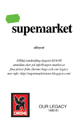 Supermarket tillsammans med Our Legacy och Chrome Bags kör en kortare alleycat med start och målgång på Supermarket på Andra Långgatan 18. Startskottet går kl 14:00, och anmälan sker på info@super-market.se. Anmälningsavgiften är på 50 kr och betalas i butiken innan start. Fina priser från Chrome Bags och Our Legacy till de tre första i mål. Det cyklas runt till stans olika supermarkets och vi startar och går i mål vi den finaste av de fina! Vi bjuder naturligtvis alla deltagare på en målgångs-öl.
