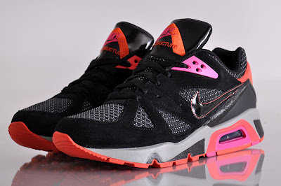 Nike’s Air Structure Triax 91, en av många skor som har otroligt mycket valmöjligheter i färg och design om man tittar på dess olika partier som finns på hela uppern. Denna gången kom den i en riktigt vass kombo där man lekt med både material och färger. Svarta partier mocka som varvas med svart polka-dots liknande grov mesh, tillsammans med detaljer i riktig knall rosa och orange, en clean midsole i grått som bryter av och en svart swoosh i patenterat läder. Välarbetad? Ja! Och vi älskar’t!
