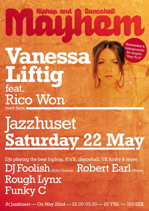 Men dessutom firar vi att VANESSA LIFTIG släpper sin underbara singel Step To It. Under kvällen visar vi videon till samma låt. Strax efter midnatt kör Vanessa några låtar LIVE tillsammans med bl.a RICO WON och JEREMIAH fr ST.