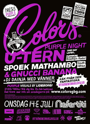“Kvällens färg är lila! Colors favoritfärg. För att den lila färgen skall bli representerad på rätt sätt har vi det stora nöjet att presentera, från Vancouver Kanada, DJ U-TERN! U-Tern eller Vaughn Oliver som han heter på riktigt är en fantastisk producent och deejay. Han är inte bara känd för sin blogg och radioshow på Brooklynradio.net: One Day Later radio (http://www.onedaylater.blogspot.com/) utan kanske främst för sina elektroniska mixtapes som t.ex “Body Music” och remixar åt allt från Stevie Wonder till Britney Spears. Men vad har detta med färgen lila att göra? Jo, U-Tern är nämligen ett extremt Prince-fan. Han har otroligt mycket outgivna demos och obskyra sidoprojekt från den lila prinsen. U-Tern har gjort åtskilliga hyllningar till Prince och framför allt med det grymma mixtapet The Purple Mixtape. Trogna Colors-gäster har dansat till flertalet U-Tern låtar under sommaren 07 och 08.