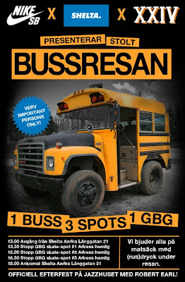 Lördagen den 18 september har vi på Shelta, XXIV och Nike SB hyrt oss en riktigt stor buss med en riktig busschaufför. Denna buss fyller vi med 53 stycken karismatiska skateboardåkare redo att rippa, plus en klassisk guide, även han redo. Bussen stannar sedan vid tre hemliga, klassiska och ökända skatespots i Göteborg med omnejd. Här släcker vi törsten samt skatar sönder spoten. Videofilmare och fotografer finns med under hela bussresan för att dokumentera denna utlykt i Göteborgs skateboardterräng. Vi bjuder alla bussresenärer på matsäck och dryck under resan.